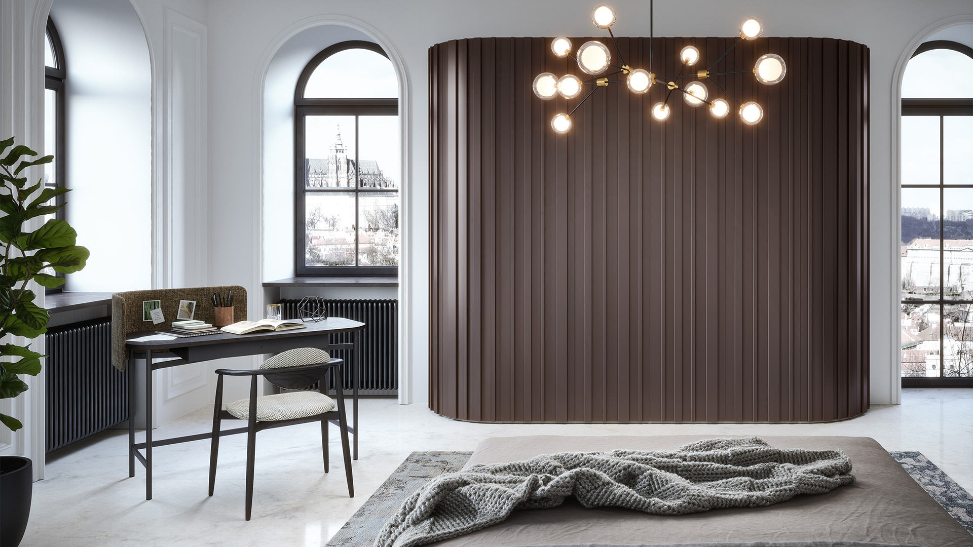 Die Türen mit senkrechten Streifen, die Grundelemente mit geschwungener Linienführung und die Tip-on-Öffnung sind nur einige der Elemente, welche die Einzigartigkeit des Schrankes mit Flügeltüren Stave ausmachen. Der Tip-on-Beschlag macht die Tür funktional, hochwertig und aus ästhetischer Sicht makellos. So wirkt der grifflose Schrank wie eine Wandtäfelung. Stave lässt sich aus diesem Grund hervorragend als Trennwand zwischen zwei Räumen einsetzen.